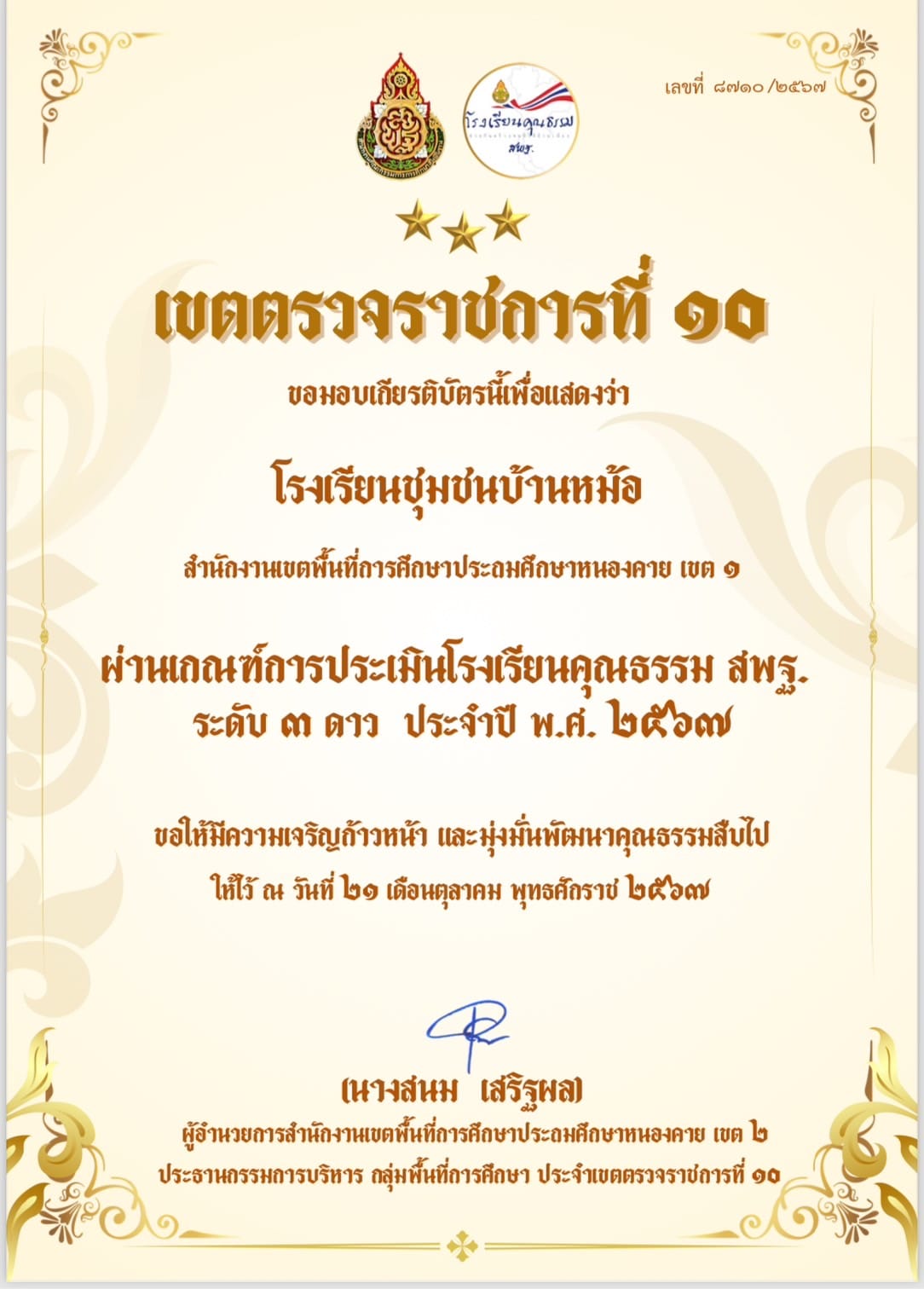 ๒๑ ตุลาคม ๒๕๖๗ โรงเรียนชุมชนบ้านหม้อ ได้รับรางวัล ผ่านเกณฑ์การประเมินโรงเรียนคุณธรรมสพฐ. ระดับ ๓ ดาว ปี พ.ศ ๒๕๖๗ นำโดย นายนพพร จันทะราช ผู้อำนวยการโรงเรียนชุมชนบ้านหม้อ พร้อมทีมงานวิชาการและคณะครูทุกท่าน มีวัตถุประสงค์เพื่อให้โรงเรียนที่ผ่านการประเมินยกระดับคุณภาพ โรงเรียนคุณธรรมจริยธรรม สพฐ ระดับ ๓ ดาว โดยการจัดกิจกรรมที่หลากหลายแก้ไขปัญหาพฤติกรรมที่ไม่พึงประสงค์ของนักเรียน ให้มีจิตสำนึกที่ดีปฏิบัติตนบนพื้นฐานคุณธรรมจริยธรรมที่ดีสอดคล้องกับอัตลักษณ์ของโรงเรียน