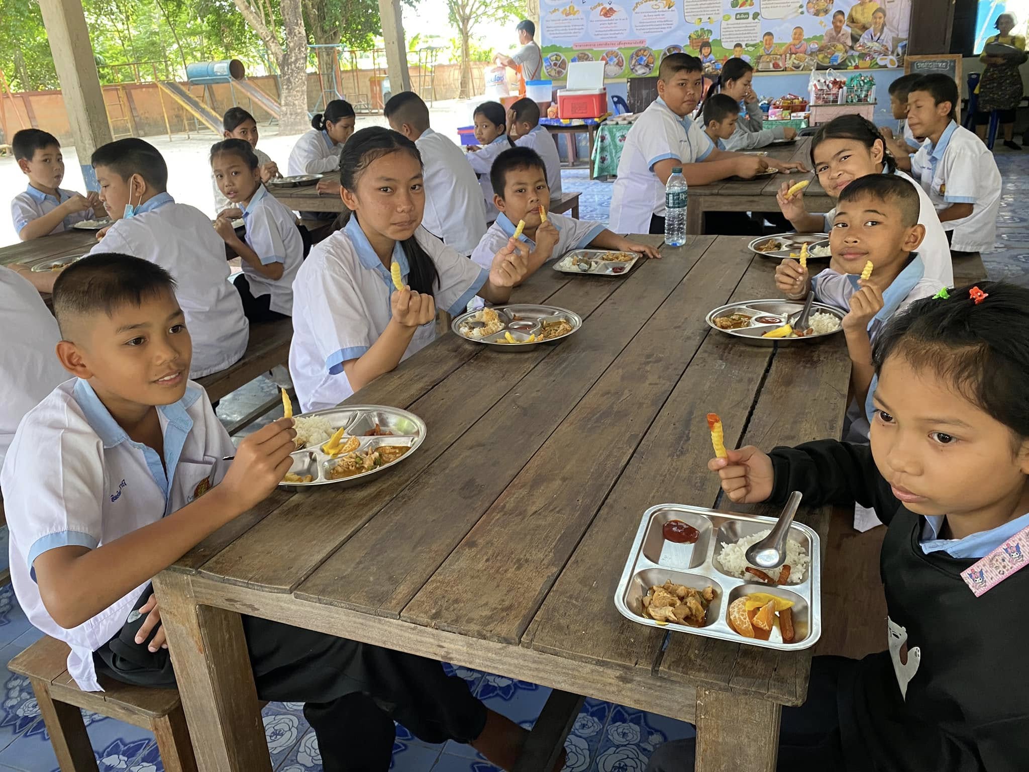 ได้มอบเฟรนช์ฟรายด์ และผักสด มาสมทบกับอาหารกลางวันที่ทางโรงเรียนได้จัดเตรียมไว้