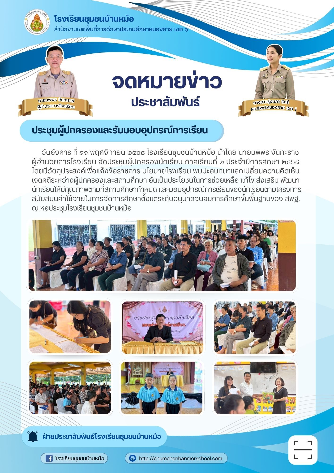 วันอังคาร ที่ ๑๑ พฤศจิกายน ๒๕๖๘ โรงเรียนชุมชนบ้านหม้อ นำโดย นายนพพร จันทะราช ผู้อำนวยการโรงเรียน จัดประชุมผู้ปกครองนักเรียน ภาคเรียนที่ ๒ ประจำปีการศึกษา ๒๕๖๘