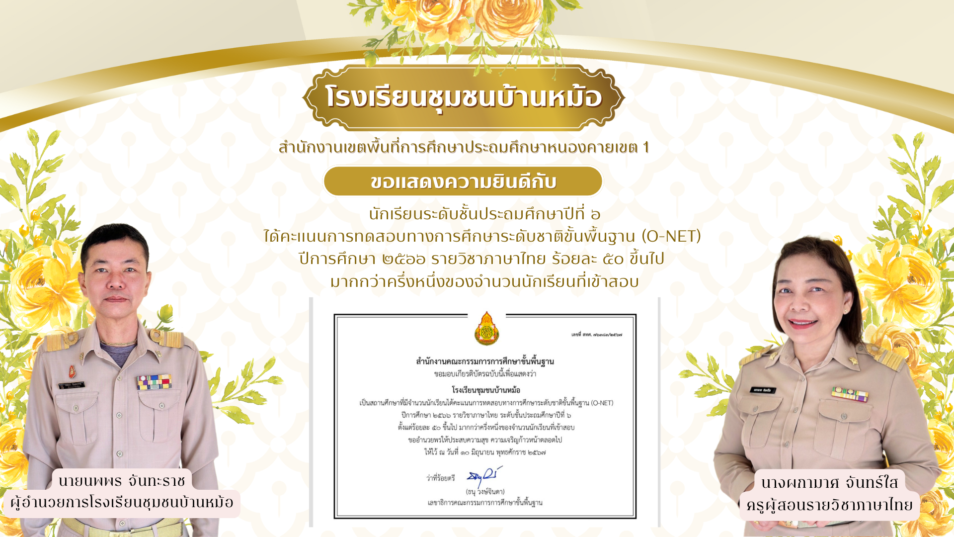 .. โรงเรียนชุมชนบ้านหม้อ ขอแสดงความยินดีกับ นักเรียนระดับชั้นประถมศึกษาปีที่ ๖ ที่ได้คะแนนการทดสอบทางการศึกษาระดับชาติขั้นพื้นฐาน (O-NET) ปีการศึกษา ๒๕๖๖ รายวิชาภาษาไทย ร้อยละ ๕๐ ขึ้นไป มากกว่าครึ่งหนึ่งของจำนวนนักเรียนที่เข้าสอบ ขอแสดงความยินดีด้วยนะคะ