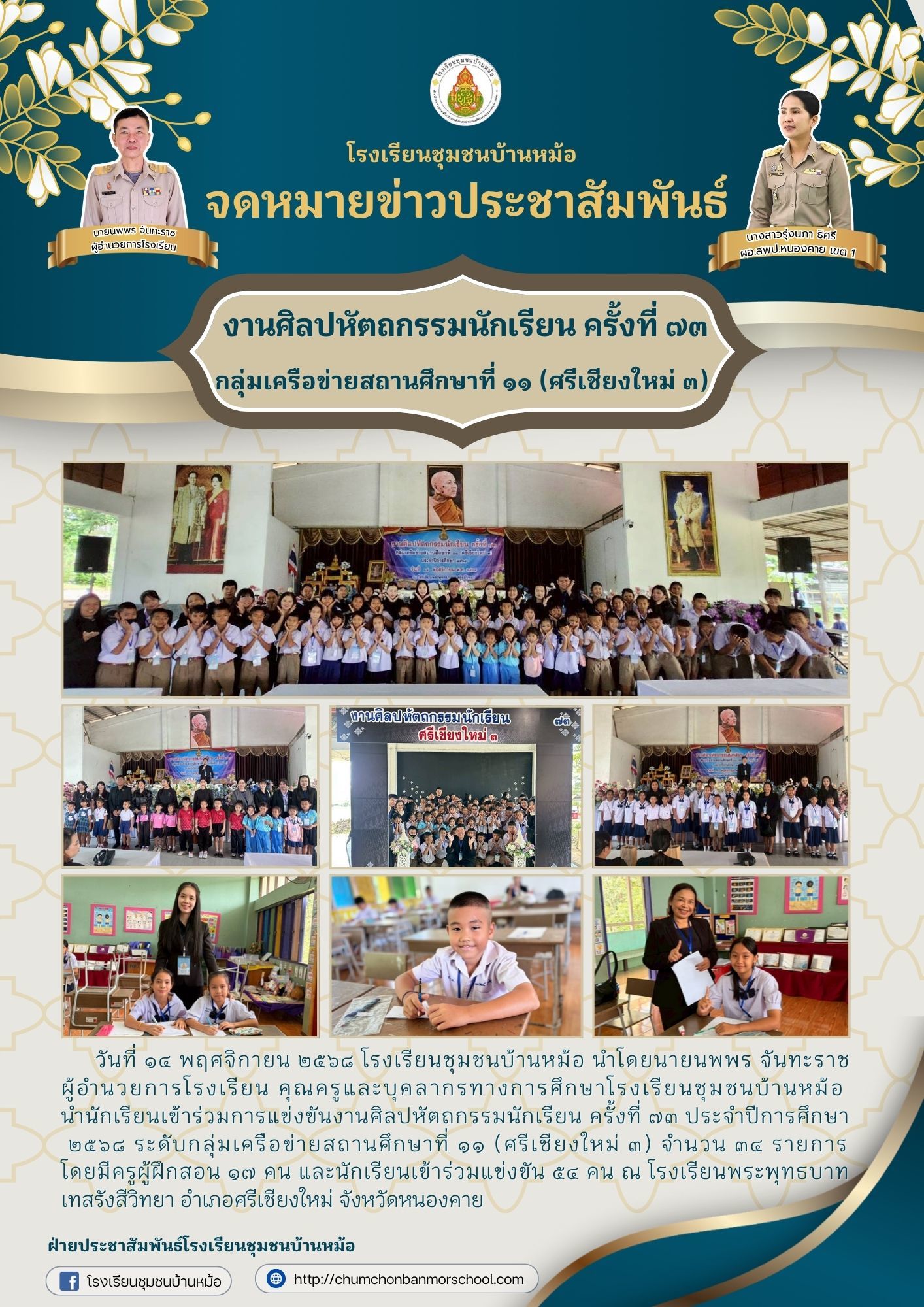 นำนักเรียนเข้าร่วมการแข่งขันงานศิลปหัตถกรรมนักเรียน ครั้งที่ ๗๓ ประจำปีการศึกษา ๒๕๖๘ ระดับกลุ่มเครือข่ายสถานศึกษาที่ ๑๑ (ศรีเชียงใหม่ ๓) จำนวน ๓๔ รายการ