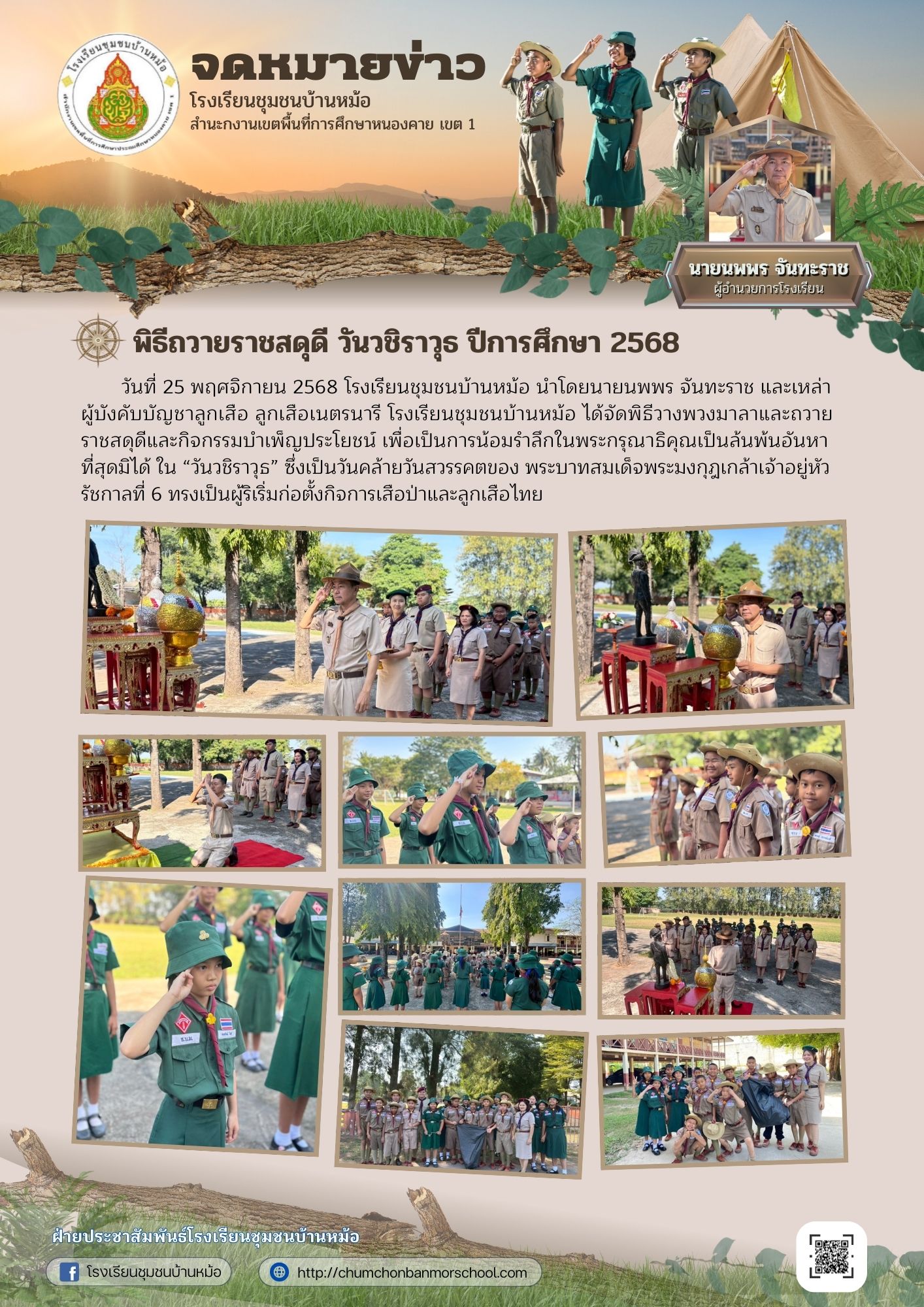 วันที่ 25 พฤศจิกายน 2568 โรงเรียนชุมชนบ้านหม้อ นำโดยนายนพพร จันทะราช และเหล่าผู้บังคับบัญชาลูกเสือ ลูกเสือเนตรนารี โรงเรียนชุมชนบ้านหม้อ